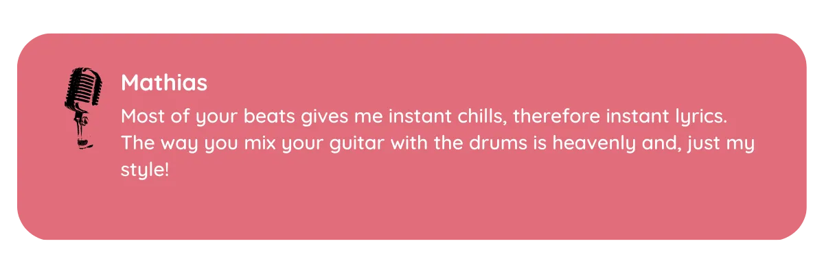 Most of your beats gives me instant chills, therefore instant lyrics. The way you mix your guitar with the drums is heavenly and, just my style!